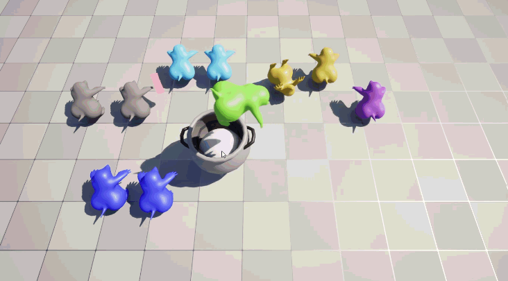 Players drag the materials (the moles) of different elements into the cauldron in the middle, and upon pressing a pot with 2 materials or more in it, you create a new potion. If the pot has less than 2 materials, pressing the pot resets the recipe.