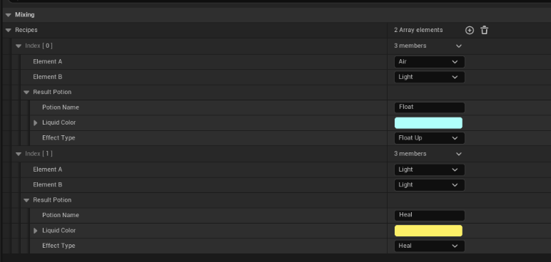 Recipes are added interactively in the UE5 interface, defined by component elements and the characteristics of the result of the recipe. Effect type maps with the effect function’s names in the other scene.