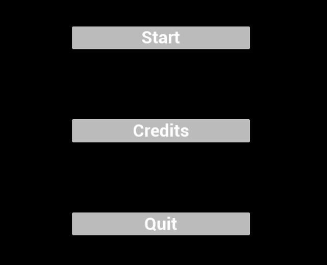 The main menu includes a button to play, a button to view the credits, and a button to quit out of the game; later there will be expansions to also add an options / settings button and a controls button that might also be located in the options / settings submenu.
