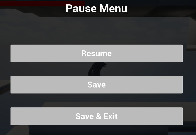 The pause menu currently has a resume button, a save button, and a save & quit button (which takes the player completely out of the game); in the future, we are going to work to make it so the save and exit button will take the player to the main screen and not directly out of the game, as well as including expansions similar to the main menu with controls and options being selectable. Both menus would also get overhauled in appearance with the background image, the styling of the buttons, and even the font being different.