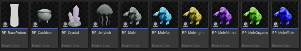 Having multiple element resources on the map for the player to pick up and craft potions. This will be replaced with the actual 3D asset resources later when ready.